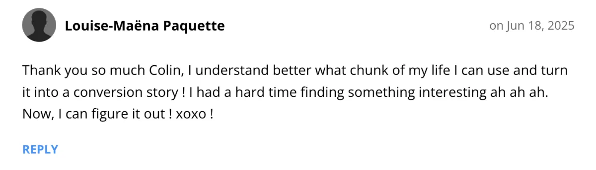 "I recently worked with Colin to work through some of my presentation that I did to over 24,000 people! I truly believe that his techniques and the art of how he tells stories and how he taught me to tell mine, deeply impacted my results. I am a fan, I am a Conversion Story Framework user and I am someone who is deeply impacted by the work that Colin does and I'm so excited to shout it from the rooftops!"